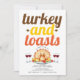 Engraçado convite à apresentação de amizade entre a Turquia e os Tostas. Mostra um peru giro em uma bandeja, copos de vinho e o texto "Turquia e Tostas" em cores marrom, amarelo e laranja em uma letra de bolfe. É perfeito para o seu janto de Ação de Graças para amigos!