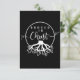 Enraizado no Cristo, este design apresenta um design preto e branco com raízes de uma árvore e texto dizendo "Enraizado no Cristo".