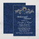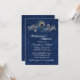 Convite de janto de ensaio de casamento feito em azul na cor damasco azul. Gráficos de um tom elegante de prata florescem, com arco azul e pena de pavão, decoram o topo do convite. O texto na cinza clara está pronto para personalizar o seu evento especial. Produtos de casamento correspondentes disponíveis.