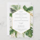 Este convite para o ensaio de casamento apresenta palma tropical de aquarela verde, folhas de banana e monstera e folhagem de ouro simulada. Ele tem um padrão correspondente de volta. Trendy geométrico com hexágonos, círculos e diamantes com bordas simuladas de sotaque dourado. Esta coleção tem convites para casamento, salve as datas, os vps, os menus e as etiquetas. Excelente para o verão, destino e casamentos de praia!