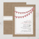 Um convite casual de janto de ensaio de casamento apresentando uma ilustração de bunting que é gingham vermelho sobre um design de inspiração de renda na frente. O fundo na frente e atrás é inspirado em burlap. Personalize o texto com detalhes da sua ocasião.