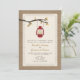 Um convite de janto de ensaio de casamento no outono do outono com um tema de natureza selvagem/acampamento apresentando uma ilustração de uma lâmpada de óleo vermelha pendurada num ramo de árvore com folhas laranja e marrom. O fundo na frente e atrás é inspirado em burlap. O recurso principal inspirou o design. Personalize o texto com suas informações.