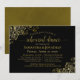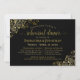 Este belo convite para jantas de ensaio é simples e elegante. Apresenta texto dourado sobre fundo preto, com folhas de papel sujo ou filigrana nos cantos. Ele tem informações sobre o ensaio de casamento, assim como sobre o janto comemorativo que se segue. Perfeito por manter a noiva informada sobre todas as festividades pré-casamento.