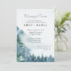 As serras de aquarela das festas de tema montanhas de ensaio rústico janto convite para casamento design mostra árvores de aquarela e montanhas em um fundo de aquarela azul empoeirado. A tipografia emparelha as letras tradicionais com o texto moderno escrito à mão. #WeddingConvites #DustyBlueWedding #WeddingConvites