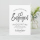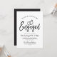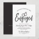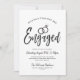 Um convite escrito, divertido e único, personalizado especificamente para a sua Festa de noivado. Ele contém as palavras "Engaged" com alianças de casamento duplas que descansam acima dele. Abaixo, este é o espaço para seus detalhes exclusivos de festa ou evento. Do lado oposto está o preto suave para complementar a frente.