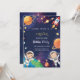 This Epic Space Birthday Invitation features a mesmerizing outer space background with smiling cartoon astronauts, colorful planets, rocket ships, glowing comets, and confetti — all set against a deep navy blue and cosmic purple sky in a soft 3D / watercolor illustration style.