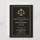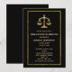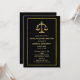 Um convite de formatura com balanças douradas da justiça e moldura em folha dourada falsa sobre um fundo preto. Simples e elegante.