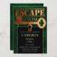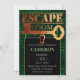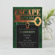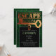 Este convite de festas personalizado apresenta um tema misterioso da sala de escape. O plano de fundo é um padrão binário de computador de cor verde a preto. Uma chave de cobre grande é impressa através do centro com uma trava de fechadura abaixo dela.