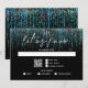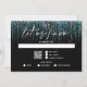 RSVP Abstrato Moderno - Uma guirlanda ousada e arrojada de glitter azul-turquesa cascata abaixo na página, em caligrafia manuscrita está "deixe-nos saber" - iniciais do casal no topo - o resto do texto é simples e limpo - tudo sobre um fundo preto. Papelaria de casamento elegante.