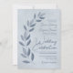Este convite para o casamento apresenta um design moderno com texto justificável e um tiroteio de folhas pintadas manualmente em tons de azul de aço e de peuque. A inscrição tem uma fonte moderna e o fundo azul empoeirado adiciona textura e profundidade. Simples, rústico, exclusivo e chic, este convite é uma forma excelente de adicionar estilo contemporâneo à elegância clássica.