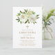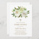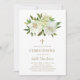 Convite floral elegante com flores pintadas de aquarela em tons neutros de marfim, branco e champanhe, juntamente com um pouco de verde e uma cruz de ouro. Abaixo estão os detalhes de seu evento em tom dourado com o nome de sua filha em script. Este belo convite é perfeito para o batizado de uma menina.