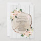 Uma fatia de madeira rústica com spray floral no canto do convite de Natal. Personalize facilmente com as informações da sua festa.