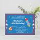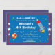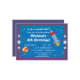 Este convite de aniversário divertido apresenta um foguete a explodir e um planeta bolinhas num fundo azul com estrelas no espaço exterior. Completamente personalizável.