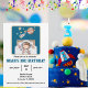 Espaço Exterior, Cuta, Simples Aniversário De Aquarela. Design apresenta um menino no quarto tocando como astronauta. A parede traseira da sala tem lindas imagens do espaço externo com estrelas, foguetes e um planeta. Perfeito para aqueles garotos que sonham em pousar na lua um dia! Personalize-o com o nome e os detalhes da festa de aniversário do seu filho. Copyright Soar em Style Design LLC.