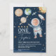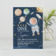 Espaço Exterior Escuro Primeira Viagem em Torno do Sol Convite à Diversão do Espaço Exterior ou primeira viagem à volta do Sol, tematizada por primeiro aniversario, apresentando um astronauta, vários planetas, espaçonave, sol e mais sobre um fundo azul escuro. Uma foto aparece no capacete do astronauta.