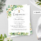 Convite de confirmação Elegante em espanhol, com detalhes florais elegantes de cor aquosa verde e elementos caligráficos modernos escritos à mão, tanto na frente como no verso. Sexo Convite neutro, ideal para confirmação de menina ou de garoto. Voltar com o quadro do estilo do logotipo moderno do canto com a data e o nome da confirmação do seu filho. Folhagem verde e flores numa bela mistura de cinzas verdes, brancas, amarelas e douradas. Estilo elegante, moderno e fresco. O mesmo design também está disponível em inglês.