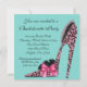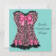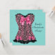 Lindo convite de festa de despedida de solteira com estampa de leopardo preto e rosa vibrante e espartilho de renda preta com sapato de salto alto estampado em leopardo rosa vibrante. Adicione seus detalhes na frente e no verso simplesmente escolhendo o botão laranja "Personalizar!" para começar a adicionar os detalhes do seu evento, estilo de fonte, tamanho e cor da fonte e texto. Por favor, note que todos os desenhos de convites que você encontrará no Zazzle são gráficos impressos em papel simples com nenhuma jóia, laço, alto relevo ou partes ou peças adicionadas.