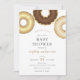 Esfregue as mamães para convidar os entes queridos para um chá de fraldas com este convite divertido. Apresentando rosquinhas de aquarela em chocolate e ouro com borrifações brilhantes para celebrar o bebê a caminho. Preencha o texto usando a caixa "Personalizar" no lado direito do item ou clique no link azul "Clique para personalizar mais" para organizar o texto, alterar as fontes e cores e também adicionar informações ou imagens adicionais a este design.
