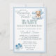 Este charmoso convite para chás de fraldas apresenta uma paleta azul suave. O design incorpora um adorável ursinho de pelúcia de bebê fofo sentado nas nuvens. Há pequenas estrelas azuis espalhadas. Personalize o convite com a sua própria redação com o modelo fácil de usar fornecido. Um par de calçados de bebê azuis está no canto inferior. O reverso tem um padrão azul com corações azuis mais escuros e um ursinho de pelúcia bonito segurando um balão. Os itens do partido de coordenação estão disponíveis no meu compro!