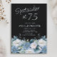 Azul empoeirado e floral branco em preto "Espetacular a 75" no convite de aniversário 75. Entre em contato comigo para obter assistência com a personalização ou para solicitar correspondência ou coordenar produtos Zazzle