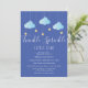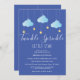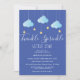 Apresentando nuvens azuis bonitas e estrelas ouros em cordas, em um fundo azul, este bebê borrifador ou o convite para chás é perfeito para todos os meninos que estão a caminho. Adicione seus detalhes de celebração em branco para criar o convite perfeito. Projetado por Thisnotme©