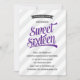 Este doce convite de 16 festas de aniversário divertido tem uma vibração atlética retrô. O texto "Doce Dezesseis" é escrito em roxo, em caracteres de escrita em negrito, e é acompanhado de um carvões de cinza de carvão curvado e de faixas diagonais de cinzas leves. Texto adicional ou uma foto pode ser adicionada à parte traseira da placa.