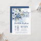 Um elegante convite para o design floral de inverno, azul e branco, Baby Sprinkle. Apresenta texto de script de aparência manuscrita, bem como estilos de texto de letras maiúsculas e minúsculas no estilo sans serif, em um azul de inverno nítido para combinar perfeitamente com o buquê floral de poinsettia azul e branca. Perfeito por planejar um chá de fraldas na moda para a mãe ser.