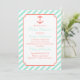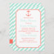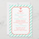 Uma silhueta de âncora colorida está sobre um fundo de listras diagonais brancas e verdes de espuma marinha. As cores neutras de gênero tornam esses convites excelentes para qualquer um que mantenha o gênero uma surpresa.