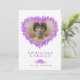 Mauve roxo de dupla face esqueceu-me e não flores celebração floral do convite para o funeral. Púrpura e branca com coração para a sua foto na frente. Substitua o texto de exemplo e dois suportes de fotos por suas próprias fotos especiais e detalhes de informações sobre eventos. Outros itens correspondentes estão disponíveis e cores. Arte lavada com tinta manual original e aquarela, nãos-me-esquecidos em um design de coroa floral por Sarah Trett para www.mylittleeden.com