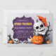 Celebre em estilo assustador com este adorável convite da festa de Halloween, com um esqueleto amigável, abóboras esculpidas, fantasmas, gato preto, e uma engraçada estrutura roxa. O espaço do centro do vazio é perfeito para adicionar os detalhes da sua festa. Ideal para festas de crianças, reuniões familiares e eventos temáticos.