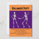 Um par de esqueletos dançarinos experimentam novos movimentos neste convite de Halloween laranja e roxo.