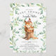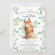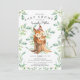 Convite para chá de fraldas bonito com o esquilo doce bebê, com a mãe sentada num toco de árvore e enquadrada com folhas de cor verde-d-água naturais sobre fundo branco. Sacudir nosso convite para ver uma folha verde correspondente para um toque especial extra.