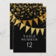 Números de mesa para recepções, festas formais, eventos de negócios e chás de noiva. Elegantes. Modernos. Chiques. Glamour discreto - com faixas de bandeirolas cintilantes em dois tons de glitter dourado com confetes cintilantes caindo em vários tamanhos e tons de dourado. Estrelas cintilantes em explosão de estrelas destacam o brilho. Um layout de texto de tipografia contemporâneo que não é nada tradicional. É simples e curto. Diz aos seus convidados: "Estamos dando uma festa e será a festa da vida!" Para a noiva e o noivo elegantes, mas não tradicionais. CORES: preto azabache e dourado, glitters dourados. Especialmente adequado para casamentos de outono ou inverno, festas de Ano Novo, festas de aniversário e anún