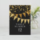 Números de Mesa para Recepções, festas formais, Eventos Empresariais e Chás de Noiva. Esbelto. Moderno. Chique. Glamour discreto - com faixas de bandeirolas cintilantes em dois tons de brilho dourado com confetes cintilantes caindo em vários tamanhos e tons de dourado. Estrelas cintilantes em explosão de estrelas destacam o brilho. Um layout de texto de tipografia contemporâneo que não é nada tradicional. É simples e curto. Diz aos seus convidados: "Estamos dando uma festa e será a festa da vida!" Para a noiva e o noivo elegantes, mas não tradicionais. CORES: preto azabache e dourado, brilhos dourados. Especialmente adequado para casamentos de outono ou inverno, festas de Ano Novo, fest