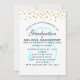 Um convite para uma celebração de formatura de enfermagem. Projetado com pontos de confete falso dourado ao longo da parte superior. Um estetoscópio azul pastel atrás do texto da festa.