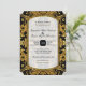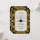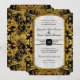 Esta coleção de convites para o casamento apresenta uma mistura popular e de tendências de vintage, tradicional clássico e de texto de tipografia contemporânea. Você pode personalizá-lo facilmente selecionando a cor de fundo usando o botão personalizá-lo e, em seguida, o selecionador de cores de fundo. Começa com uma imagem elegante, na moda e brilhante de aspecto com brilho dourado (SEM REAL GLITTER, esta é uma imagem impressa plana e gráfica) numa cor damasco rococó rico, rococó, rococó, rococó. Em seguida, um simples quadro gráfico, tipográfico, de dupla borda, com cantos entalhados e uma parte superior suavemente arredondada em brilhos cintilantes ouros, com um contorno preto, define o fundo de texto branco suavemente fino interno. O verso tem uma estrutura de estilo de etiqueta em que as iniciais da noiva e do noivo são apresentadas com uma seringa de ornamentado no meio. O texto do seu convite de casamento é fácil de preencher usando as camadas de modelo. Este convite de casamento é perfeitamente adequado para eventos de empate negro, casamentos no inverno formais, reuniões elegantes e temas da era Edwardian, Excelente Gatsby, Manor House Inglês ou Temas da Era Edwardiana. CORES: preto, dourado e branco macio