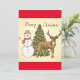 Uma cena de natal alegre de estilo vintage com uma árvore, um boneco de neve e uma rena. Este design parece realmente eficaz nestes Convites