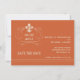 Anuncie seus planos de casamento para amigos e familiares com estes cartões Salve a Data Fleur de Lis em Estilo Elegante Retro. O cartão apresenta um design elegante com o símbolo Fleur de Lis e espaço para adicionar a data do seu casamento. O cartão lê "salve a data" em uma impressão branco fora de moda em estilo retrô. Personalize com seus nomes e data de casamento. Mostrado aqui em um fundo laranja queimado.