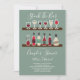 Retro Estoque o Chá Casal Bar Convite com uma prateleira com garrafas e óculos de bar licorosos colocados sobre um fundo verde com uma coordenação marrom atrás para um toque especial.