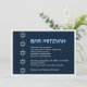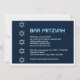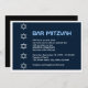 O convite da estrela do Bar David Pattern Mitzvah apresenta cinco padrões de estrelas alinhados verticalmente em um plano de fundo listrado, todos dentro de uma linha de borda branca. O título 'Bar Mitzvah' está em azul. Disponível também para bat mitzvahs. © Manhã 6