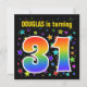 Este design divertido, vibrante e entusiasmante apresenta um padrão inspirado por estrelas coloridas, juntamente com o número "31", que tem um espectro de inspiração multicolorido no arco-íris ou um padrão de gradiente. O nome na frente pode ser personalizado. A parte traseira apresenta detalhes personalizáveis sobre a parte. Convites de festas de aniversários como este podem ser enviados a potenciais convidados para uma festa de aniversário que comemora o trinta primeiro aniversário de alguém. [~Z0000349]