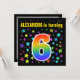 Este design divertido, excitante e vibrante apresenta um padrão colorido de estrelas, junto com o número "6", que possui um espectro multicolorido como o arco-íris ou padrão de gradiente. O nome na frente pode ser personalizado. A parte traseira apresenta informações personalizadas sobre a parte. Convites de festas de aniversários como este podem ser usados para convidar convidados para uma festa de aniversário que está sendo realizada para comemorar o sexto aniversário de alguém. [~Z0000349]