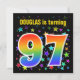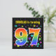 Este design vibrante, divertido e entusiasmante apresenta um padrão colorido de formas estelares, juntamente com o número "97", que inclui um espectro multicolorido como o arco-íris ou um padrão de gradiente. O nome na frente pode ser personalizado. A parte traseira contém informações personalizadas sobre a parte. Convites de festas de aniversários como este podem ser enviados a potenciais participantes para uma festa de aniversário que se realiza para celebrar o 97º aniversário de alguém. [~Z0000349]