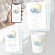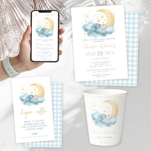 O chá de um bebê com o tema "Twinkle Twinkle" é um convite para o bebê com o menino azul e a lua ouro com estrelas.