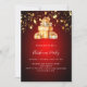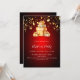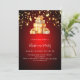 Um convite para uma festa de Natal. Um fundo de gradiente vermelho. Decorado com estrelas ouros e uma pilha de presentes. Personalize e adicione os detalhes. Texto branco.