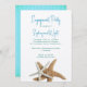 Modelo de convite pré-festa de casamento com estrelas grandes do mar e texto azul aqua. Fontes modernas são usadas neste convite para festa de noivado, chá de casal, janto de ensaio ou outro encontro para um casal. A design da praia inclui um casal de peixe-estrela branco e castanho no fundo e um texto azul-esverdeado. Mostrado em papel texturizado atualizado, com muitos outros tipos de papel a serem selecionados, bem como em formas de canto e borda. O texto maior é azul-aqua e o texto impresso é verde-marinho. O gráfico na parte de trás do papel é de listras azul-verdes.