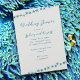O chá de casamento das estrelas do mar azul é convidado por roteiros modernos e fontes impressas. Pequenos estrelas azuis fazem linhas diagonais no topo e no fundo das cinzas leves e convites coloridos. Use este modelo para um chá ou festa de noivado, ou até mesmo um janto de ensaio.