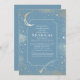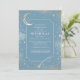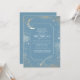 Convite do Serviço Memorial Funeral Themed Celestial: Este convite personalizável apresenta um design azul poeirento sereno com galáxias distantes, planetas, estrela cadente e lua crescente. Criado a honrar o espírito de um sonhador, é perfeito para comemorar alguém que sempre alcançou as estrelas, estimou o espetáculo, e encontrou felicidade sob o céu noturno estrelado.