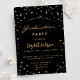 Um cartão de convite glamouroso para uma festa de formatura para ele e para ela. Um fundo preto decorado com estrelas douradas falsas. Personalize e adicione um nome e detalhes da parte. O texto Graduação e o nome são escritos com um script de estilo moderno, escrito à mão. Texto colorido do ouro. Fundo: fundo preto e estrelas ouros.