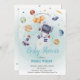 Convite único de chá de fraldas moço-a-moça com estrelas, astronauta, planeta e foguete.